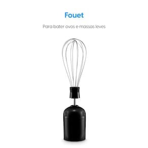 O aparelho é 3 em 1: mixer, triturador e batedor de ovos ou massas leves. Acompanha miniprocessador para triturar e picar alimentos com capacidade para 0,3 litros, copo para misturas com capacidade de 700 ml, lâminas em aço afiadas de alta performance, fouet flexível para bater ovos, claras ou massas leves.