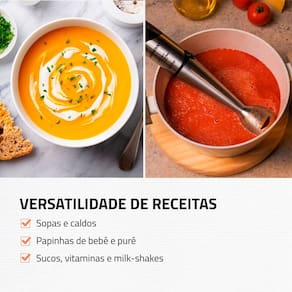 VERSATILIDADE DE RECEITAS: Você pode preparar deliciosas receitas como sucos, vitaminas, purês, sopas, molhos e muitos mais. Liberte sua criatividade e arrase nas refeições!