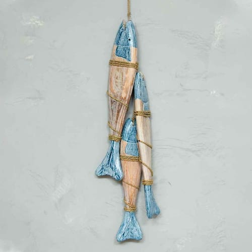 Móbile Decorativo 3 Peixes Madeira Balsa de Bali Móbile Decorativo 3 Peixes Madeira Balsa de Bali O móbile decorativo de peixes é uma ótima escolha para quem quer trazer um pouco da vibe do mar para dentro de casa ou do escritório. Acrescente outros itens marítimos como remos, âncoras e seres marinhos como baleias e deixe qualquer ambiente mais leve. Material: madeira balsa Cores Predominates: Pátina Azul & Marrom Claro Peso: aproximadamente 670gr Altura: total 71cm / De Cada Peixe 46cm, 39cm, 50cm Largura: 10cm Origem: bali O produto é artesanal, fabricado e e por isso torna-se único apresentando pequenas variações de cor, brilho, peso, tamanho. O tom de madeira também pode apresentar variações. Não deixe a sua peça em contato com a água. Limpe-a apenas com pano úmido sem qualquer componente químico. As fotos são ilustrativas. Qualquer produto adicional utilizado na composição da foto deve ser comprado separadamente. Marca: Não Informado