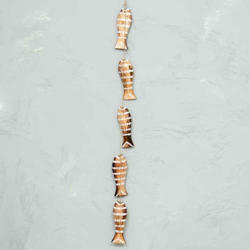 Móbile Decorativo 5 Peixes Madeira Balsa de Bali Marrom & Branco Móbile Decorativo 5 Peixes Madeira Balsa de Bali Marrom & Branco O móbile decorativo de peixes é uma ótima escolha para quem quer trazer um pouco da vibe do mar para dentro de casa ou do escritório. Acrescente outros itens marítimos como remos, âncoras e seres marinhos como baleias e deixe qualquer ambiente mais leve. Material: madeira balsa Cores Predominates: Marrom & Branco Peso: aproximadamente 200gr Altura: total 78cm / De Cada Peixe 15cm Largura: 6cm Origem: bali O produto é artesanal, fabricado e de Bali e por isso pode apresentar pequenas variações de cor, tonalidade, brilho, peso e tamanho. Não deixe a sua peça em contato prolongado com a água, a não ser que seja peça que possa ser exposta ao sol e chuva. As fotos são ilustrativas. Qualquer produto adicional utilizado na composição das fotos deve ser comprado separadamente. Marca: Não Informado