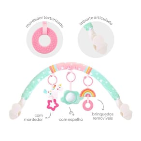 O móbile para carrinho magic unicórnio da buba é ideal para entreter o bebê. Macio e com cores suaves, estimula o desenvolvimento motor, visual, auditivo e emocional. Possui mordedor em silicone texturizado, unicórnio e arco-íris de pelúcia com chocalho, espelho, todos removíveis para o pequeno brincar.