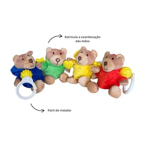 Informações do Produto: O Móbile para carrinho em pelúcia ursos plush é um móbile prático, portátil, ideal para acompanhar a criança durante os passeios. Com quatro adoráveis e coloridos ursinhos de pelúcia na temática brinquedos, que instigam a sensibilidade motora e a interação, este móbile foi projetado para desenvolver as habilidades sensoriais do olhar e exploração sensorial. As cores vibrantes e em alto contraste estimulam a coordenação das mãos e visão e ajudam no desenvolvimento da imaginação. É fácil de instalar, idealmente no carrinho do bebê, podendo acompanhá-lo em todos os lugares e momentos.