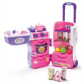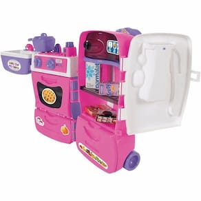 Uma cozinha completa em um só brinquedo. Esta super maleta se transforma em uma cozinha completa! Tem fogão, forninho, pia, gavetas, torradeira e uma geladeira com filtro de água na porta que sai água de verdade! A brincadeira fica completa com panelinhas, pratinhos e talheres e frutas, e caixinhas. A Mobility Chef tem alça retrátil e rodinhas para sua super chef levar a brincadeira onde quiser.