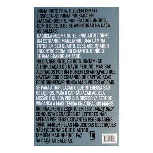 Após hospedar-se numa pousada de Massachusets, a fim de se aventurar na caça às baleias, Ismael conhece um estranho, e se juntam à tripulação do navio Pequod, mas são alertados por um desconhecido que navegar sob o comando do capitão Acab pode significar nunca mais voltar ao cais. Originalmente escrito em 1851, Moby Dick conquista gerações de leitores pelas minuciosas descrições não ficcionais que o autor, também marinheiro, faz da caça às baleias.