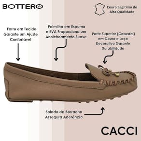 Esse mocassim Bottero foi criado para oferecer elegância, praticidade e conforto em cada detalhe. Produzido em couro autêntico de alta qualidade, apresenta acabamento refinado e um laço decorativo na parte superior que realça seu estilo clássico e atemporal. O forro em tecido garante um ajuste confortável, enquanto a palmilha em espuma com EVA proporciona maciez e um acolchoamento suave, tornando cada passo mais leve.