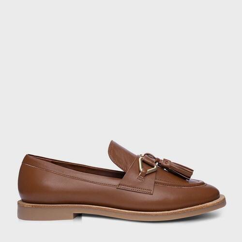 Mocassim, também conhecido como loafer, de couro. O modelo tem salto baixo bloco de madeira e bico redondo. Fechado, traz recorte lateral na gáspea e aplicação de tira de couro com bridão e barbicachos sobre o cabedal. FEITO EM COURO.