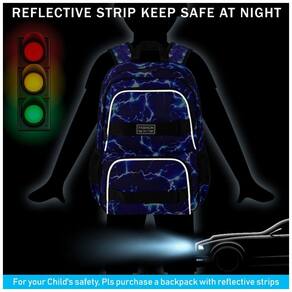 A mochila possui superfície resistente à água e tiras refletivas na parte frontal e nas alças, contribuindo para maior visibilidade em ambientes com baixa luminosidade. O desenho ergonômico inclui costas com estrutura respirável em 360°, alças em formato “S” acolchoadas e ajustáveis, além de 2 bolsos frontais com zíper, 2 bolsos laterais para garrafa ou snacks, compartimento interno com divisória para notebook e estojo retangular para lápis e canetas.