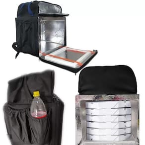 Outra vantagem dessa mochila é a capacidade de suportar 4 garrafas de refrigerante nas laterais, permitindo que você transporte mais produtos de uma só vez. A caixa de isopor laminada interna é resistente e possui capacidade para 45 litros, garantindo o armazenamento adequado dos alimentos.