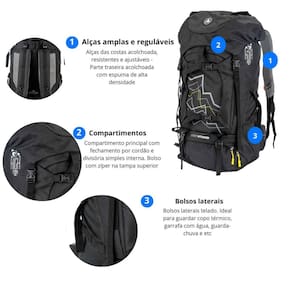 Fabricada em poliéster de alta qualidade, a Mochila Camping Trilha Reforçada Amplo Compartimento 60L possui as seguintes especificações: