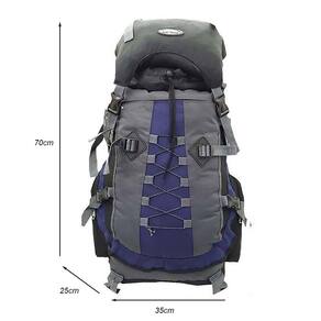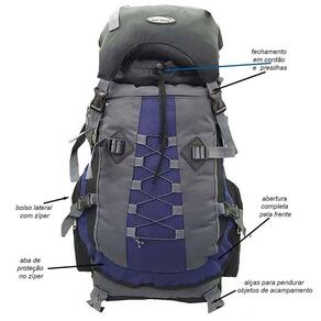 A mochila possui 70 cm de altura x 35 cm de largura x 25 cm de profundidade, com capacidade total de 60 litros.