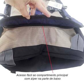 A parte traseira da mochila também é acolchoada com espuma de alta densidade, proporcionando um apoio extra para as costas. Além disso, conta com cinto abdominal com presilha, para maior firmeza da mochila no corpo, e cinto na altura da cintura com presilha, garantindo ainda mais segurança.