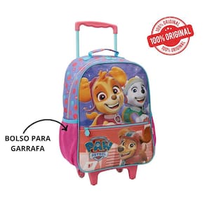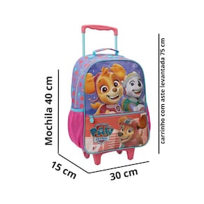 Mochila mala com rodas 16 paw patrol patrulha canina sky xeryus linha de patrulha canina mala com rodinhas para os fãs do desenho em tamanho 16, é produzida em poliéster resistente e estampado. Painel frontal com o chase em material suave e fofinho e destaque para os demais personagens em pvc cristal estampado. Compartimento principal amplo, 2 bolsos laterais em mesh com elástico. Zíper com puxadores personalizados. Carrinho em metal com travas.