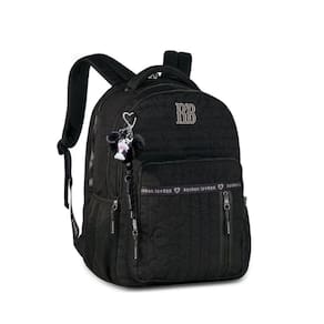 Mochila RB27005: confeccionada em nylon com matelassê de estrelas e corações, traz compartimento principal amplo, divisórias internas, bolso antifurto traseiro, espaço acolchoado para notebook e tablet, bolsos telados laterais e bordado exclusivo no costado. Acompanha chaveiro pompom, mascote 3D, medalhinha de metal, cadarço personalizado e cartela de adesivos.