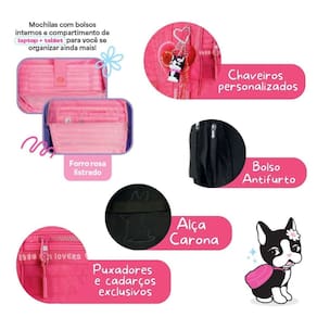 Este kit combina funcionalidade, conforto e muito estilo em um conjunto completo da Rebecca Bonbon. A mochila RB27006 traz design sofisticado com matelassê em estrelas e corações, forro rosa listrado e amplo espaço interno, incluindo compartimentos acolchoados para notebook e tablet, três bolsos frontais um deles com divisórias organizadoras , bolsos laterais telados e bolso antifurto traseiro. Os detalhes encantadores incluem chaveiro pompom de coração, mascote em 3D, medalhinha de metal e cartela de adesivos exclusivos. Dimensões aproximadas da mochila: 44x33x14cm.