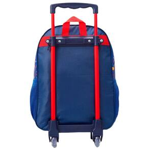 A mochila de rodinhas apresenta o icônico escudo do FC Barcelona em um design vibrante e moderno. Com um compartimento principal espaçoso e bolsos laterais para itens pequenos, é ideal para torcedores que querem levar sua energia para a escola ou atividades. As rodinhas e o carrinho ajustável garantem conforto e praticidade no transporte.frontal.