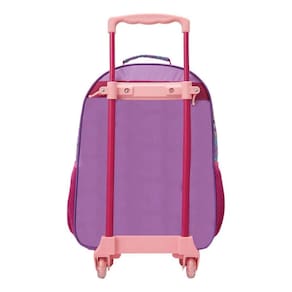 Características / Composição: - Material: Poliéster 420D resistente. - Carrinho: Estrutura de metal pintado com hastes arredondadas, travas de altura e 2 rodas com glitter e freio frontal. - Puxadores Personalizados: Zíperes exclusivos em metal pintado. - Alças: Alça de mão acolchoada em poliéster com revestimento em nylon para maior conforto. - Dimensões: - Largura: 27 cm - Altura: 35 cm - Comprimento: 14 cm