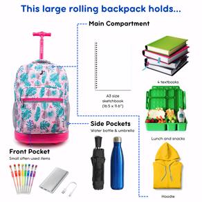 Viaje, volte para a escola ou durma na casa do pijama com estilo, com seus pertences bem guardados na mochila rolante J World Sunrise. A versatilidade da mochila com rodas Sunrise permite que ela funcione tanto como bagagem de mão rolante quanto como mochila com tiras para estudantes. Possui alça telescópica de alumínio leve, rodas macias e silenciosas e molde de proteção inferior para maior durabilidade. Organize todos os seus pertences com um bolso frontal equipado com porta-lápis, chaveiro e bolso de malha, perfeito para guardar itens que podem ser facilmente acessados. Para quem precisa de hidratação em trânsito, tem bolsos laterais de malha que são ideais para guardar garrafas de água e vários outros recipientes para bebidas.