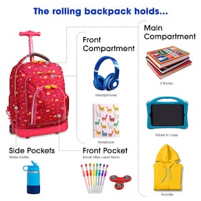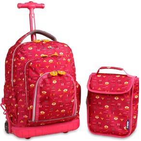 Este conjunto divertido e colorido inclui uma mochila com rodas e uma lancheira isolada e está disponível em padrões fofos para crianças. Funciona como uma bolsa com rodas para a escola e uma divertida mochila de mão para crianças de 3 a 9 anos. A bolsa de rodas Kids possui rodas macias e silenciosas com um sistema magnético de iluminação automática (as crianças vão adorar isso!) e tem um sistema de alça de travamento embutido de três estágios com um botão de liberação. Seu compartimento principal com zíper armazena facilmente os livros, pastas, projetos e jaqueta de seu filho, e um bolso organizador frontal contém um porta-chaves, um porta-lápis e um bolso de malha. Os bolsos laterais de malha contêm garrafas de água, e a mochila rolante J World Lollipop com lancheira tem alças de ombro acolchoadas com malha de ar e uma alça acolchoada. A bolsa também pode ser usada como bagagem de mão de viagem. Seu filho pode transportar essa bagagem de mão infantil com rodas pelo aeroporto com orgulho e você não precisa! Esta mochila de mão cabe embaixo de um assento de avião.