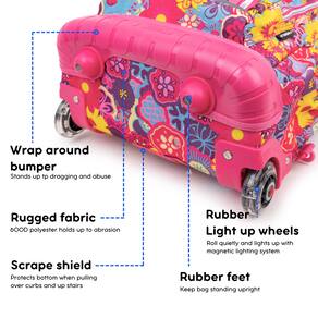 Este conjunto divertido e colorido inclui uma mochila com rodas e uma lancheira isolada e está disponível em padrões fofos para crianças. Funciona como uma bolsa com rodas para a escola e uma divertida mochila de mão para crianças de 3 a 9 anos. A bolsa de rodas Kids possui rodas macias e silenciosas com um sistema magnético de iluminação automática (as crianças vão adorar isso!) e tem um sistema de alça de travamento embutido de três estágios com um botão de liberação. Seu compartimento principal com zíper armazena facilmente os livros, pastas, projetos e jaqueta de seu filho, e um bolso organizador frontal contém um porta-chaves, um porta-lápis e um bolso de malha. Os bolsos laterais de malha contêm garrafas de água, e a mochila rolante J World Lollipop com lancheira tem alças de ombro acolchoadas com malha de ar e uma alça acolchoada. A bolsa também pode ser usada como bagagem de mão de viagem. Seu filho pode transportar essa bagagem de mão infantil com rodas pelo aeroporto com orgulho e você não precisa! Esta mochila de mão cabe embaixo de um assento de avião.