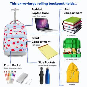 A inovadora e versátil mochila com rodinhas J World Sundance para escolas e viagens possui um compartimento para laptop de 15,6" e um molde de proteção inferior para garantir que seu dispositivo não seja danificado durante a viagem. A mochila para laptop com rodas Sundance pode ser utilizada como bagagem de mão ou como mochila para laptop com tiras que é fácil de transportar. Organize todos os seus pertences com um bolso frontal equipado com porta-lápis, chaveiro e bolso de malha, perfeito para guardar itens que podem ser facilmente acessados. Para quem precisa de hidratação em trânsito, tem bolsos laterais de malha que são ideais para guardar garrafas de água e vários outros recipientes para bebidas. Com enorme capacidade, esta mochila para laptop carrega facilmente um laptop, fichário de 3 polegadas, 3 livros didáticos universitários, cadernos, disco rígido portátil e almoço com espaço de sobra. A alça de alumínio de tubo único se estende até 34 ou 39 polegadas para facilitar a manobrabilidade de crianças e adultos de até 6 pés e 3 polegadas de altura.