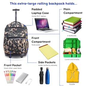 A inovadora e versátil mochila com rodinhas J World Sundance para escolas e viagens possui um compartimento para laptop de 15,6" e um molde de proteção inferior para garantir que seu dispositivo não seja danificado durante a viagem. A mochila para laptop com rodas Sundance pode ser utilizada como bagagem de mão ou como mochila para laptop com tiras que é fácil de transportar. Organize todos os seus pertences com um bolso frontal equipado com porta-lápis, chaveiro e bolso de malha, perfeito para guardar itens que podem ser facilmente acessados. Para quem precisa de hidratação em trânsito, tem bolsos laterais de malha que são ideais para guardar garrafas de água e vários outros recipientes para bebidas. Com enorme capacidade, esta mochila para laptop carrega facilmente um laptop, fichário de 3 polegadas, 3 livros didáticos universitários, cadernos, disco rígido portátil e almoço com espaço de sobra. A alça de alumínio de tubo único se estende até 34 ou 39 polegadas para facilitar a manobrabilidade de crianças e adultos de até 6 pés e 3 polegadas de altura.