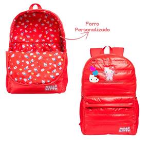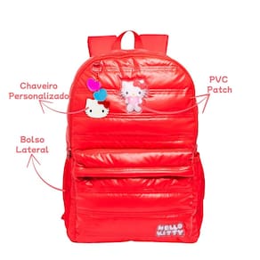 Características: - Confeccionada em Puffer - Alça de mão - Alças acolchoadas e ajustáveis - Dois bolsos laterais em mesh - Puxadores de zíper personalizados - Chaveiro Hello Kitty - Forro personalizado