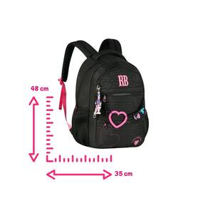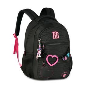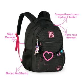 Características Mochila: - Alça de mão - Alça de costas - Alça carona - Bolso antifurto - Bolsos Laterais - Confeccionados em material soft com Matelassê localizado com corações - Chaveiros de miçangas, mascote 3D - Corrente com coração emborrachado e pingentes - Logo RB em metal colorido - Zíper tratorado com puxadores com cadarço - Compartimentos para laptop + tablet- Forro rossa listrado