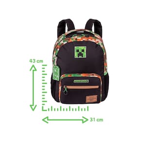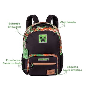 Características Mochila: - Estampa oficial Minecraft - Alça de mão acolchoada - Alças de costas acolchoadas e ajustáveis - Chaveiro exclusivo Minecraft - Bolsos Laterais p/garrafinhas
