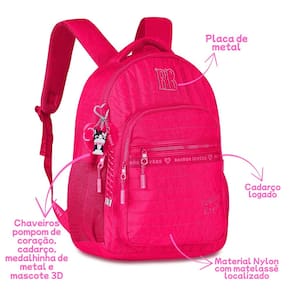Características Mochila: - Alça de mão - Alça de costas - Alça carona - Bolso antifurto - Bolsos Laterais - Confeccionados em material soft com Matelassê localizado com corações - Chaveiros pompom de coração, cadarço, medalhinha de metal e mascote 3D - Logo RB em metal colorido - Zíper tratorado com puxadores com cadarço - Compartimentos para laptop + tablet- Forro rossa listrado
