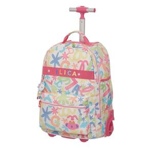 Coleção confeccionada em poliéster estampado em transfer, logo em silkscreen emborrachado. Puxador de zíper em corda com ponteira emborrachada em formato de U. Costas de tela de espuma personalizada com pespontos e etiqueta bordada na alça de ombro, além de contar com etiquetas personalizadas.