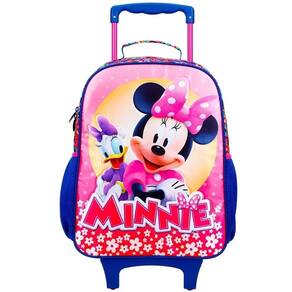 A Mochila Rodinhas Minnie Jogo Alto-relevo é de tamanho 16", fabricada em poliéster resistente e estampada. Possui painel frontal com estampa da Minnie, compartimento principal amplo, 2 bolsos laterais de mesh com poliéster e elástico. O zíper tem puxadores personalizados. A alça de mão é de poliéster com mesh. O carrinho é de metal com travas.