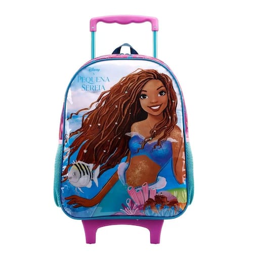 Mochila de rodinhas confeccionada em material de alta qualidade com puxadores personalizados. Possui 3 bolsos externos, sendo 1 com fechamento por zíper e 2 de redinhas nas laterais para garrafinha de água. O bolso principal conta com frente colorida, estampada com acabamento brilhante. Prática, a mochila é excelente para levar objetos infantis, como material escolar e lanche. Os pequenos vão amar o design divertido. Produto temático da Pequena Sereia, princesa da Disney.