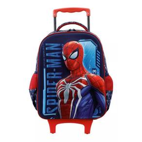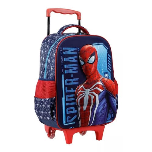 A Mochila Rodinhas Marvel's Spider-man Jogo Alto-relevo 11700 é de tamanho 16", fabricada em poliéster resistente e estampada. Possui painel frontal EVA 3D Nylon (relevo), compartimento principal amplo, 2 bolsos laterais de mesh com poliéster e elástico. O zíper tem puxadores personalizados. A alça de mão é de poliéster com mesh. O carrinho é de metal com travas.