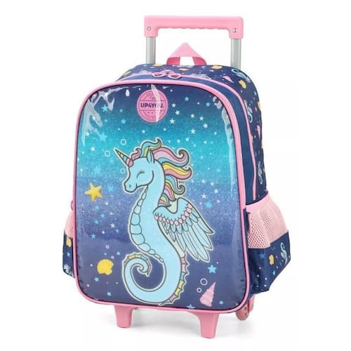 Benefícios da Mochila: - Praticidade e estilo em uma única mochila: a Mochila Infantil Rodinhas Up4you Petit Cavalo Marinho possui bolso frontal e lateral, perfeitos para organizar os itens do seu filho(a) de forma prática. - Brilho e diversão garantidos: as rodinhas com glitter dão um toque especial à mochila, tornando o transporte ainda mais divertido para as crianças. - Fácil de guardar e transportar: o sistema dobrável da mochila permite que ela seja compactada quando não estiver em uso, facilitando o armazenamento e transporte.
