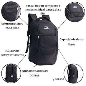 - Tamanho: 45X32X14CM - Capacidade: 20L - Múltiplos Compartimentos - 3 Bolsos - Logo Bordado nas costas - Zíper Personalizado da Marca - Logo da Marca no Topo - Composição: Poliéster - Compartimento Para Bola