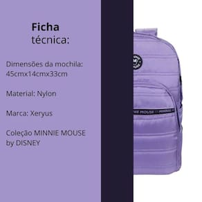 A Mochila de Costa Minnie Mouse Lilás com Matelassê da Xeryus é a escolha perfeita para unir estilo e funcionalidade no dia a dia. Com detalhes especiais e um design inspirado na Minnie Mouse, ela oferece conforto, praticidade e muito charme.