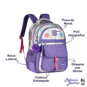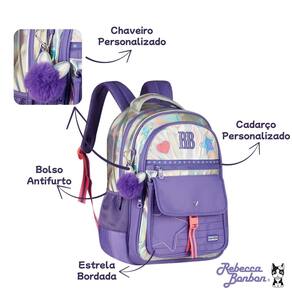 Características: - Alça de mão - Alça de costas acolchoadas e ajustáveis - Bolsos laterais - Forro interno rosa listrado - Compartimento de Laptop + Tablet - Mosquetão formato de coração - Chaveiro pompom, cadarço e estrela acrílico - Logo metalizado - Patches atoalhados e Etiqueta com Glitter - Puxador personalizado - Zíper tratorado - Bolso Antifurto - Alça Carona - Visual holográfico brilhante que muda conforme a luz