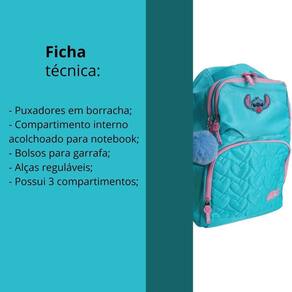 Características: - dimensões: 45 cm de altura x 31 cm de largura x 15 cm de profundidade, com capacidade aproximada de 21 litros. - material: feita de 100% poliéster, com forro também em poliéster, garantindo durabilidade e resistência. - estrutura: possui 03 compartimentos para melhor organização e uma alça de mão reforçada para transporte prático. - estilo único: logo emborrachado e design exclusivo do stitch que encanta fãs de todas as idades.