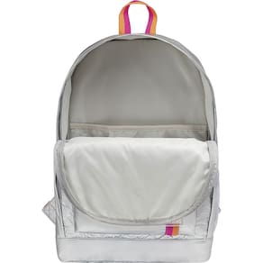 Toda prática, conta com um compartimento principal de amplo espaço interno, bolso frontal, um bolso lateral, puxadores em zíper, alça de mão e alças de costas reguláveis. Na cor prata, conta com detalhes de estrelas em leve relevo por toda a peça, tornando-a ainda mais bonita.