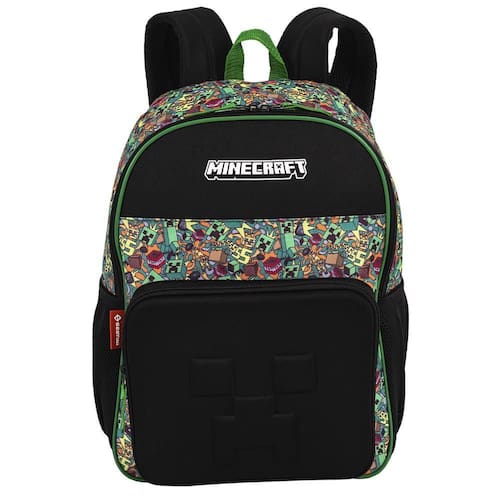 Mochila De Costas Escolar Infantil Minecraft Funtage Sestini Cor: Preto Ative o modo criativo e explore a rotina de estudos com a Mochila de Rodinhas Funtage do Minecraft Estampada com um vibrante mosaico dos elementos do jogo, essa mochila traz a magia do Minecraft para o dia a dia escolar. Ampla e funcional, ela possui um compartimento principal, bolsos laterais em elástico para garrafinhas e um bolso frontal com a icônica face do Creeper em 3D. As alças de costas acolchoadas garantem conforto e praticidade, tornando o transporte ainda mais fácil para os pequenos exploradores. Perfeita para quem busca estilo, diversão e conforto na escola