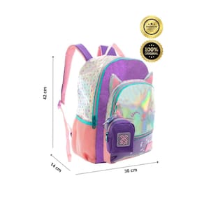 Design de gatinha: A mochila possui um design adorável com detalhes holográficos e glitter. Três compartimentos: Espaço amplo para organizar livros, cadernos e outros materiais. Bolso frontal: Ideal para guardar pequenos objetos. Bolsos laterais: Perfeitos para garrafinhas ou outros objetos pequenos. Alças acolchoadas: Proporcionam maior conforto durante o transporte. Alça de mão: Facilita o transporte da mochila. Zíper resistente: Garante maior durabilidade e segurança.