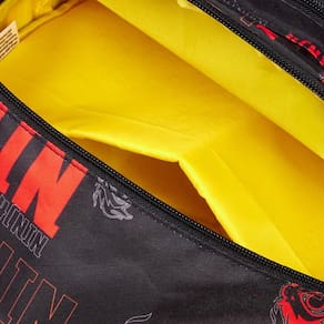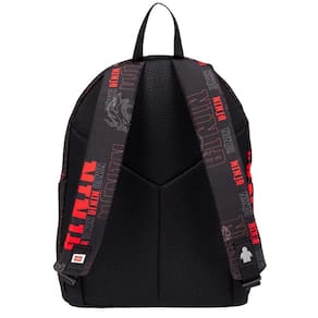 Mochila de costas, que conta com estampa frontal, bolso frontal, telinha lateral, compartimento grande com fechamento em zíper e etiquetas personalizadas.