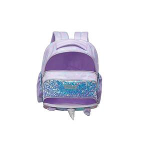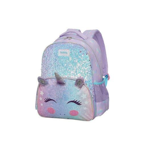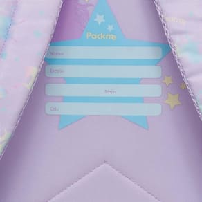 Mochila de costas, que conta com estampa frontal, bolso frontal, telinha lateral, compartimento grande com fechamento em zíper e etiquetas personalizadas.