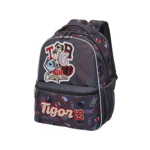 Mochila Tigor T Tigre, que conta com estampa frontal, bolso frontal, telinha lateral, compartimento grande com fechamento em zíper e etiquetas personalizadas.