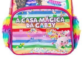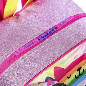 Mochila escolar Sestini com alças de costas espumadas e reguláveis, bolso lateral em tela com elástico, tag identificador, painel frontal em cetim e etiquetas personalizadas.