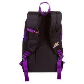 Mochila Grande NBA Magic - Lakers, com Alça das Costas Espumadas e Bolso Escondido nas Costas. Produzida em Poliéster, um material resistente. Conta com bolso principal grande, bolso frontal menor com fechamento em zíper personalizado, telinhas laterais, estampa frontal e etiquetas personalizadas