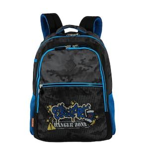 Mochila com bolsos laterias em tela com elástico, alças de costas reguláveis, estampa frontal, bolso frontal com zíper, alça de mão e etiquetas personalizadas.