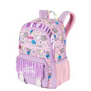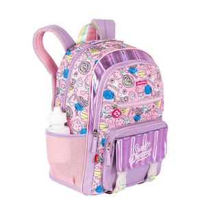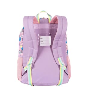 Mochila com bolsos laterias em tela com elástico, alças de costas reguláveis, estampa frontal, bolso frontal com zíper, alça de mão e etiquetas personalizadas.