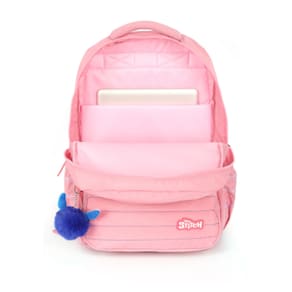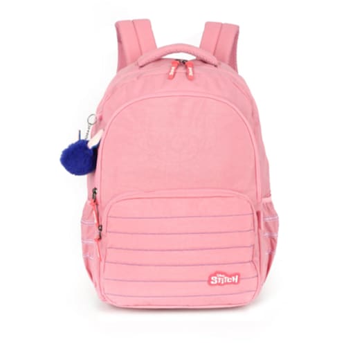 Detalhes apaixonantes: Tecido Crinkle, logo emborrachado, bordado Stitch e chaveiro de pompom.