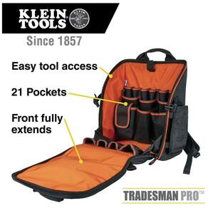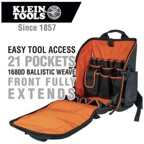 Mochila com 21 bolsos e interior amplo para zenamento máximo de ferramentas. A frente da mochila abre até a metade para acesso rápido à ferramenta ou estende se totalmente para acesso à estação de trabalho. Feito de tecido balístico 1680d resistente à água para maior durabilidade. A alça elástica segura a Luz de Trabalho N de Cat. 56028 vendida separadamente para iluminação sem as mãos do interior da mochila ao trabalhar em áreas com pouca luz. Interior laranja para fácil visibilidade da ferramenta. Acolchoamento extra nas alças e nas costas para conforto de transporte. Peito ajustável e alças inferiores para um ajuste personalizado Marca: Não Informado
